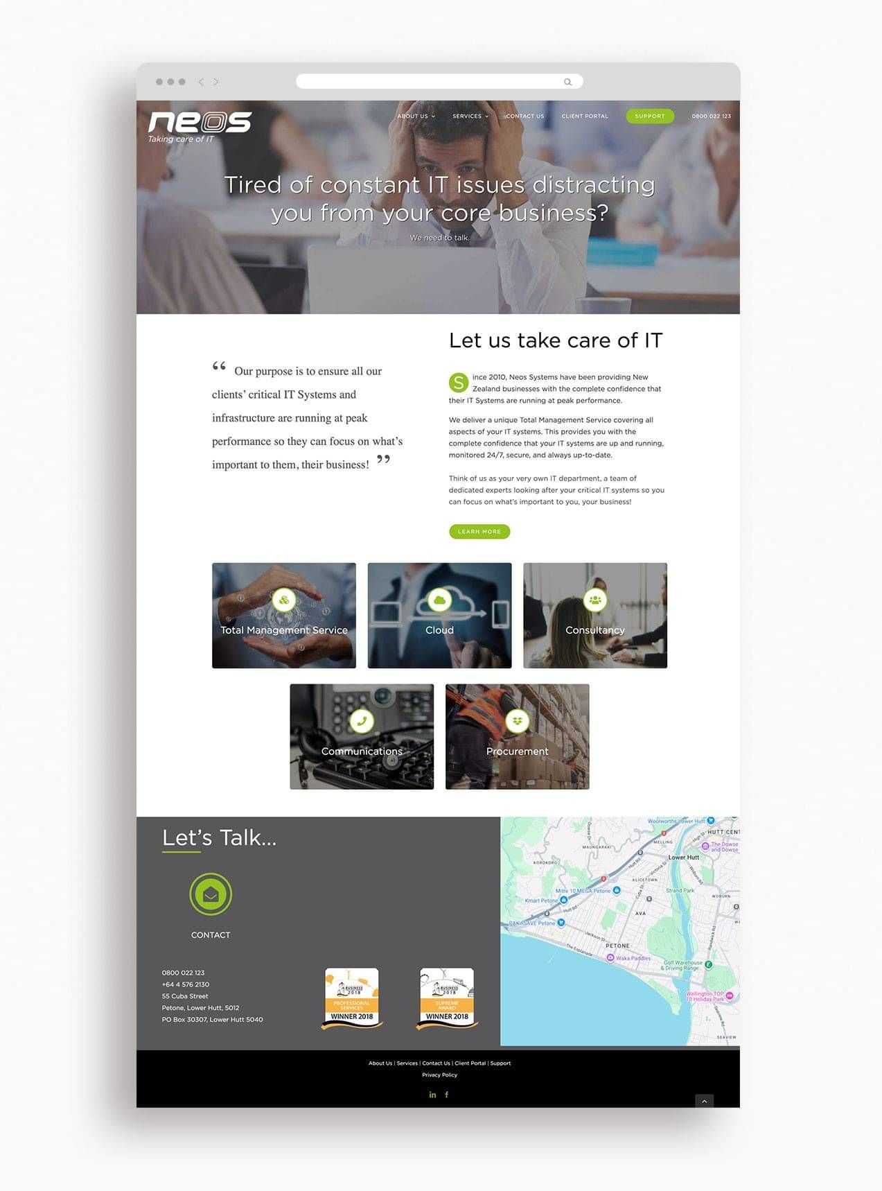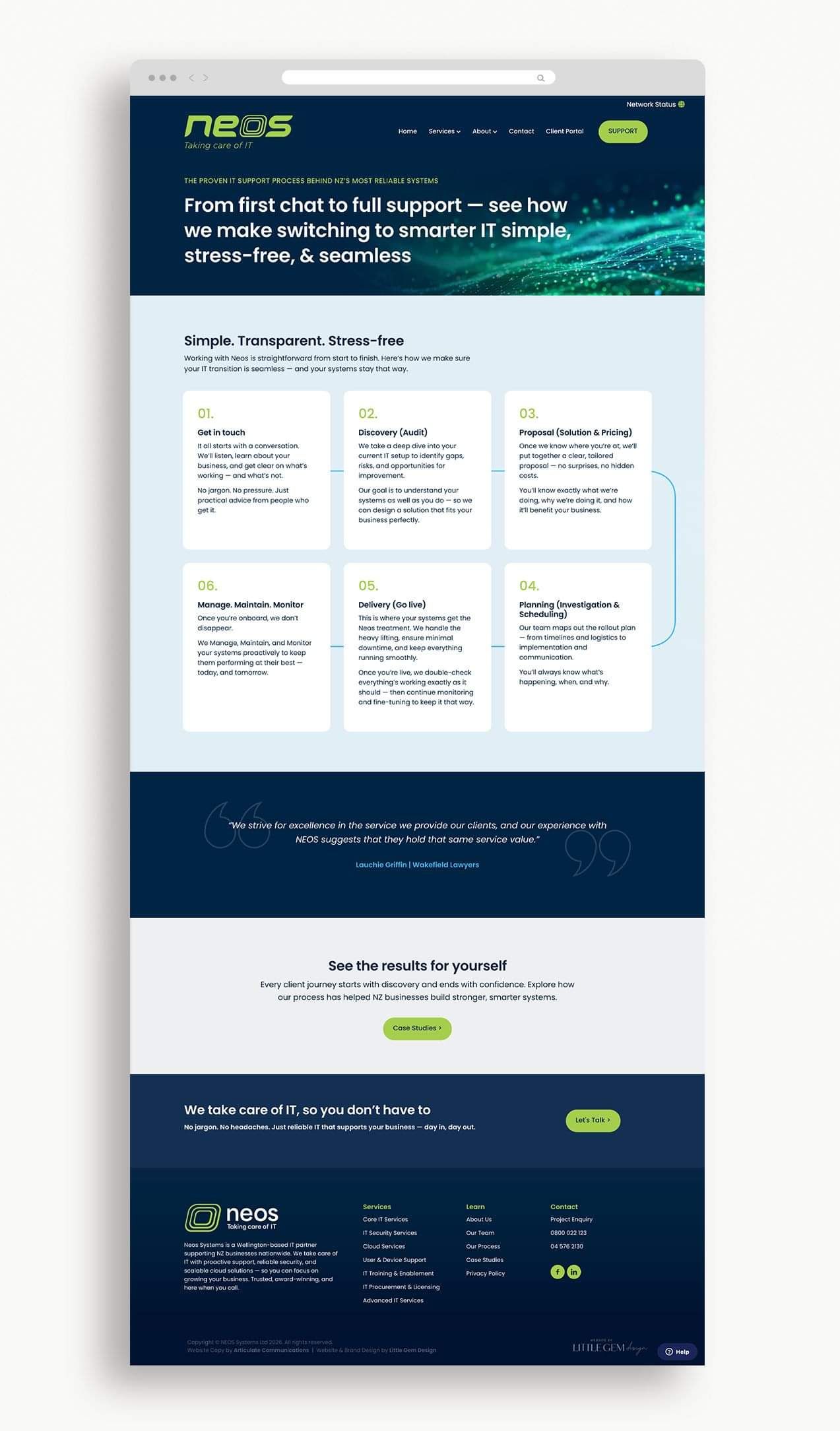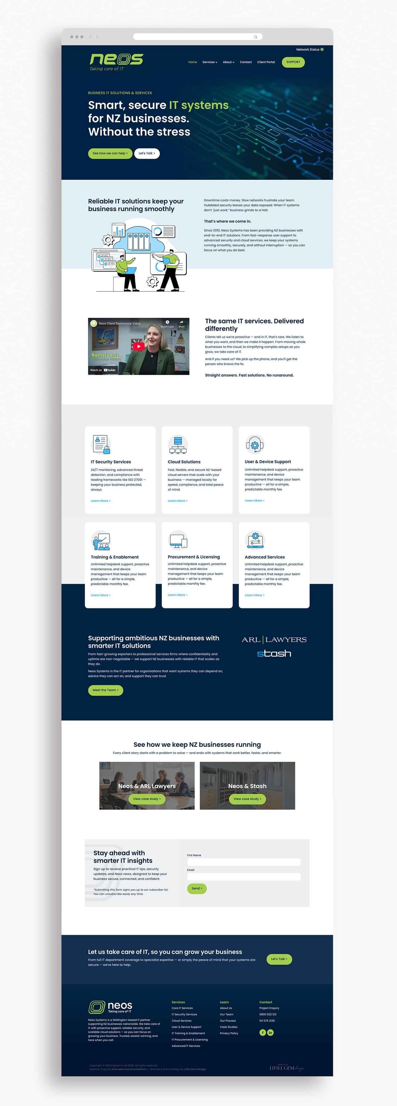 Neos Systems is an IT services provider working with businesses across New Zealand. Little Gem Design redesigned the Neos Systems website to better reflect the quality and professionalism of its services. The previous website felt dated and didn’t clearly showcase Neos’ expertise. The new site has an intuitive navigation, a clear content hierarchy, and purposeful copy, supported by custom illustrations that add clarity and visual interest. The result is a clean, contemporary website that confidently communicates Neos Systems’ offering and supports their growing business.